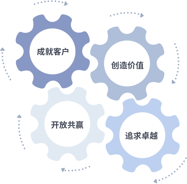 成就客户是一切决策的出发点,,,创造价值是衡量所有工作的标准,,,,追求卓越是我们做事做人的态度,,,开放共赢是我们的格局也是最终的结果。。价值观的齿轮环环相扣,,,,推动着组织里的每个人不断向前。。